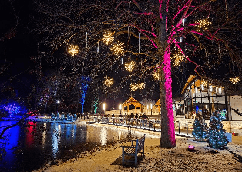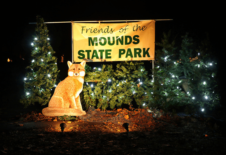 For a rustic and peaceful holiday experience, head to Mounds State Park. The park and campground transform with glowing displays and decorated sites, creating a simple but beautiful drive-through event. It’s the perfect low-key winter outing to enjoy from the comfort of your vehicle.