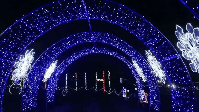 Located in northwest Indiana, Winter WonderLights offers a drive-through experience filled with illuminated tunnels, oversized holiday characters, and music-synced scenes. It’s great for families looking for a big Christmas light show outside the Indianapolis metro.