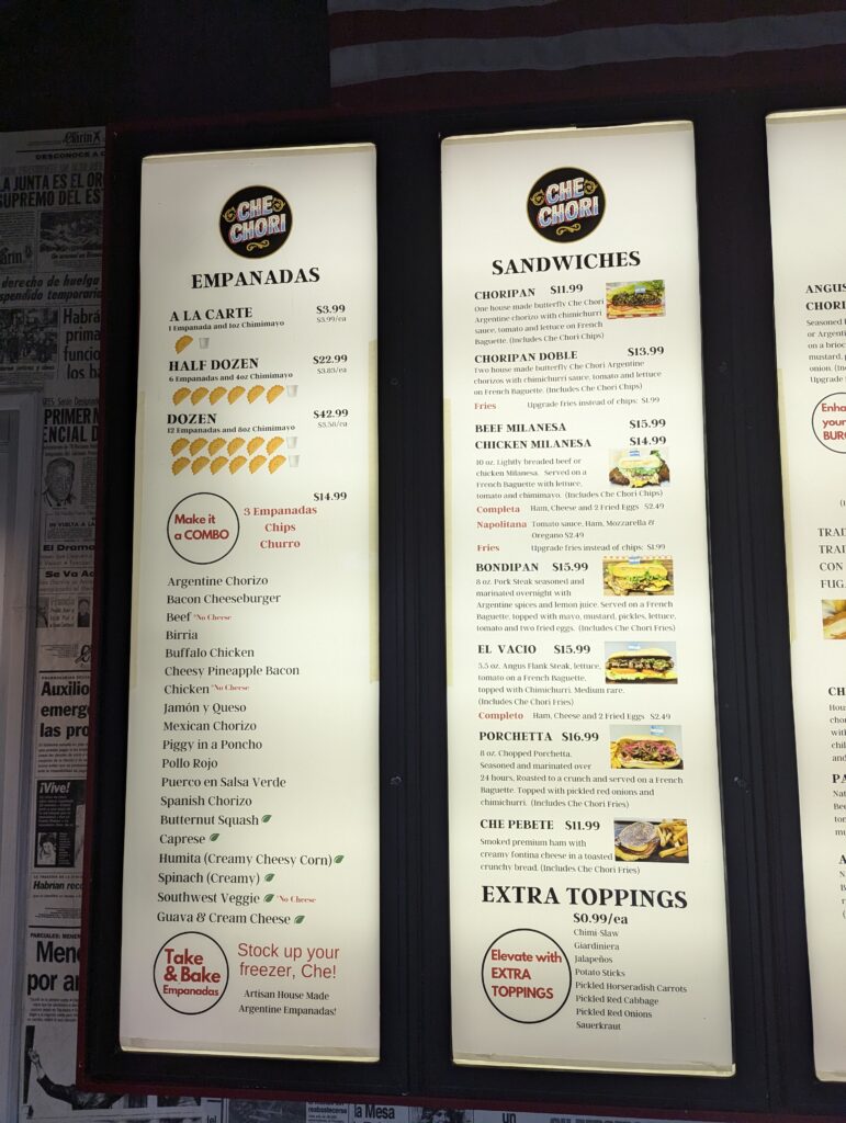 Che Chori is a grab and go Argentinian restaurant on the west side of Indianapolis. They offer numerous empanadas, sandwiches, and a few desserts. You can even order frozen empanadas for your own future event! There is no indoor seating, but there are a few picnic tables