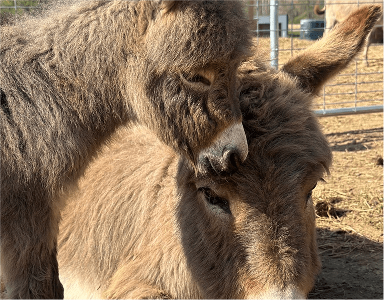 Ethel & Fred – a bonded mother-son donkey pair who adore back scratches