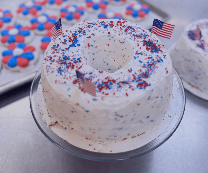 Red, white, blue confetti angel food cake. Taylor's Bakery