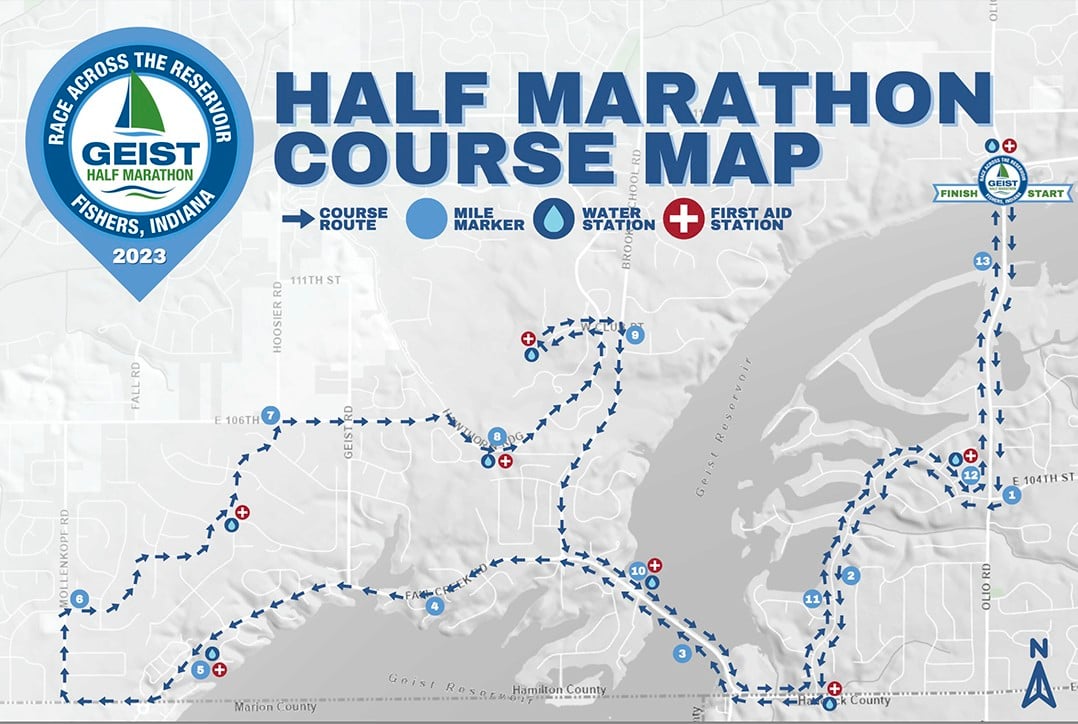 The course for the Geist Half Marathon takes runners and walkers through neighborhoods and along the waterfront of Geist Reservoir. (Image courtesy of the City of Fishers)