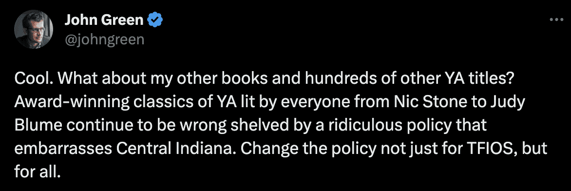 “Upon reviewing the page(s) of ‘The Fault in Our Stars’ book that was the basis of the Director’s and review staff’s reason to move the book out of the Teen section, I believe there was an error in implementing the Collection Development Policy and that this book should be moved back to the Teen section immediately. The Board of Trustees will discuss further what went wrong with the review process at the next public board meeting.”
