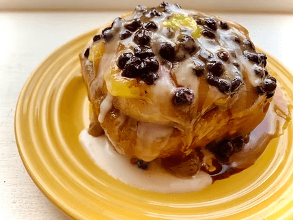 When I walked in, the S’mores roll was calling my name. It came filled with chocolate and smothered in caramel and melted marshmallows. Each bite left me wanting another and seriously considering a second roll when it was gone. It paired perfectly with my made-to-order vanilla iced latte.