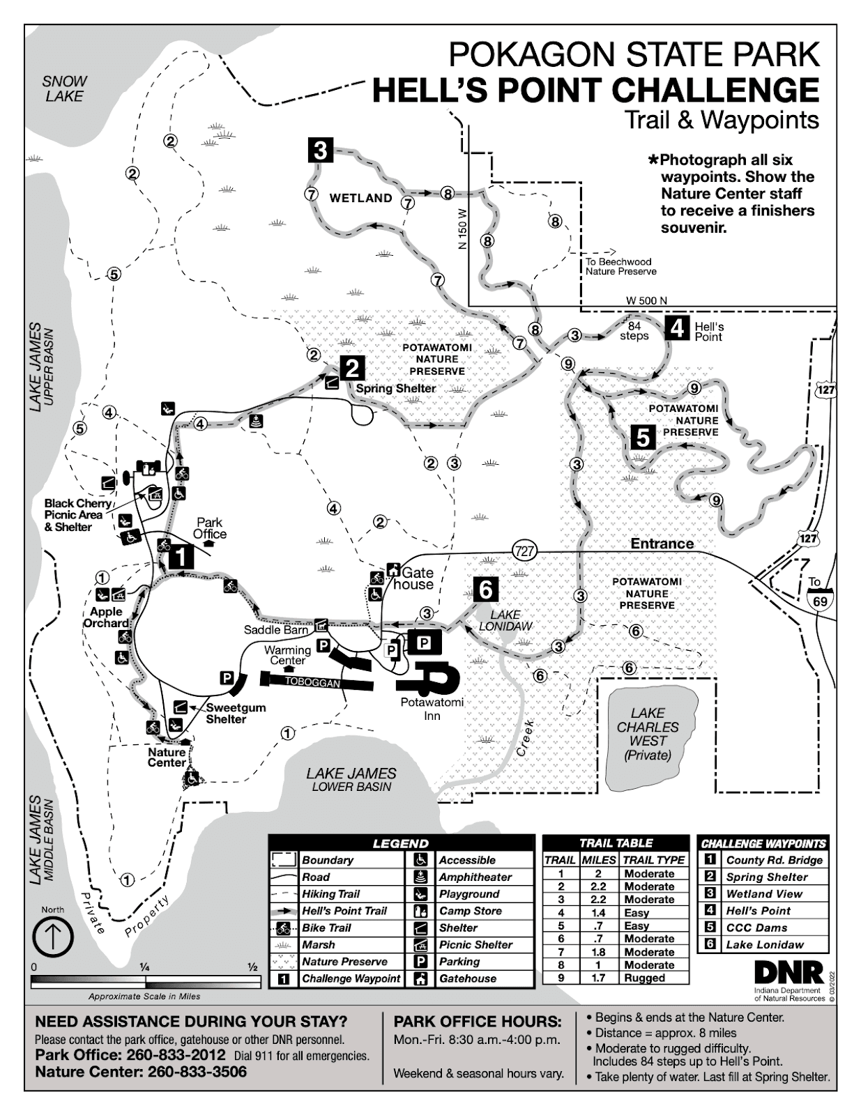 For the last stop, the Hell's Point Challenge takes you past the saddle barn. It’s open every day except Tuesday and Thursday. There are trail and pony rides available for people of all ages and abilities. The challenge finally ends up back at the nature center. My watch said I’d hiked 8.32 miles. I was tired but felt energized and alive with all the beauty I’d seen. It felt like every corner I turned on a trail opened up a new habitat or place of awe! You can experience that too when you visit Pokagon State Park. It’s a magical place where history, beauty, and fun exist together.