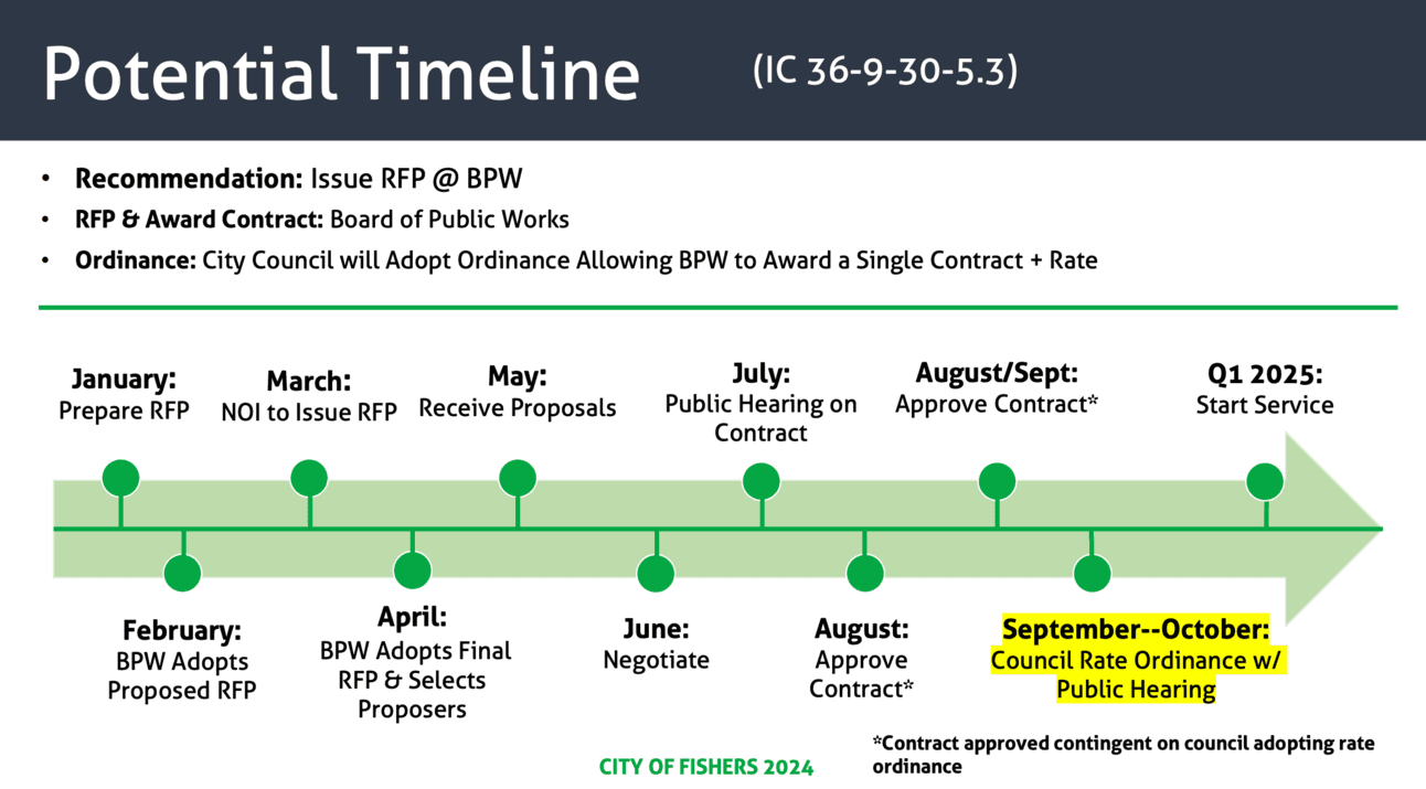 One big thing:The City of Fishers is moving forward with taking bids for a city-wide trash contract. The above picture shows the timeline.