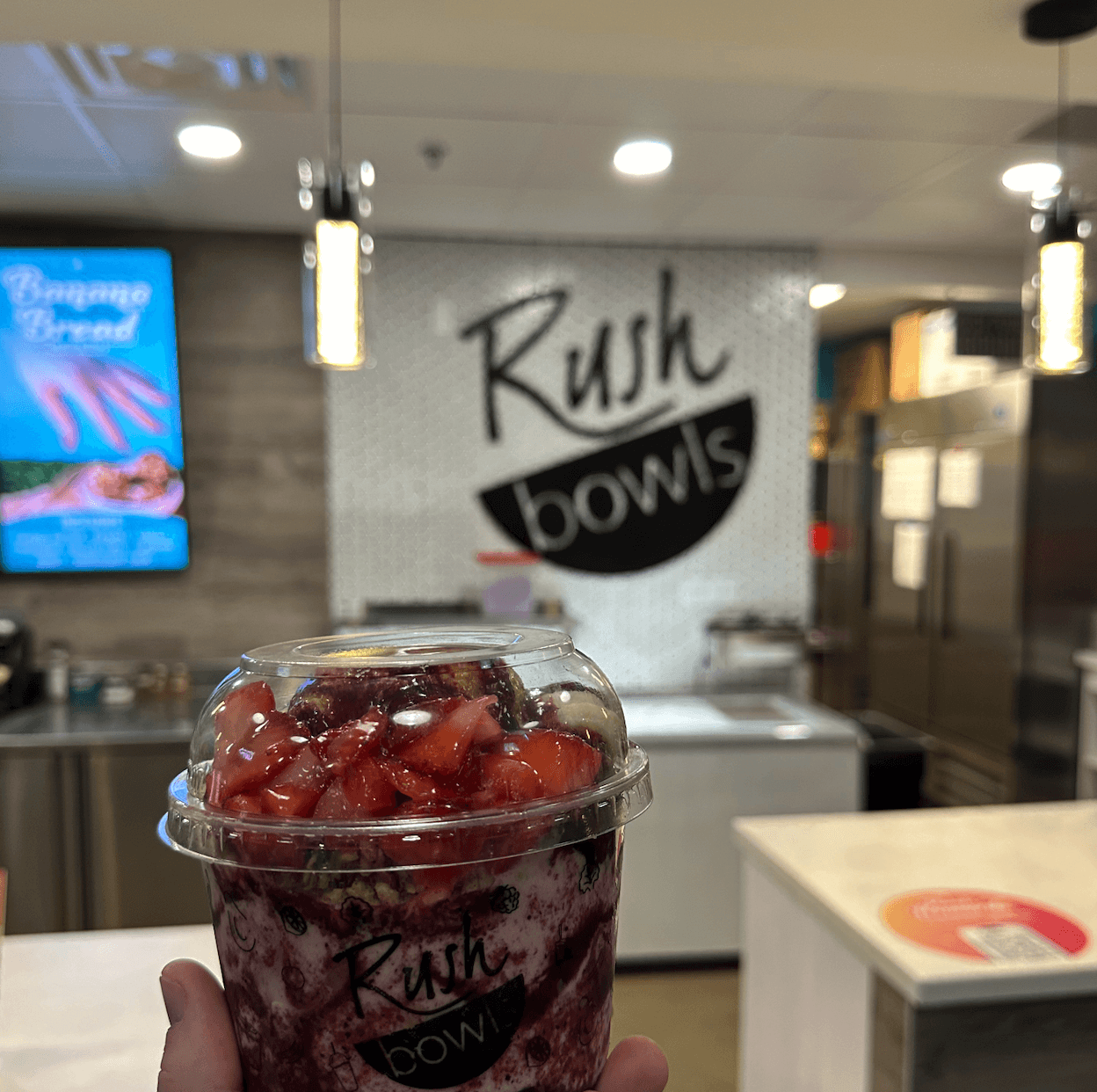 Rush Bowls is a newer franchise in downtown Fishers. They serve blended fruit bowls and smoothies and were recently featured on WishTV. So we had to try ‘em:
