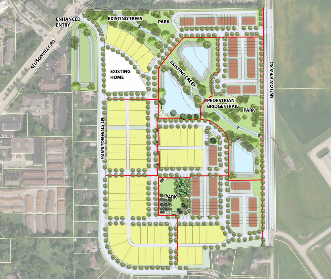 In its place may come a new development featuring 66 single family homes, 102 townhomes, multiple parks, and a walking trail to connect it all. That’s about as much news as there is to share at the moment.