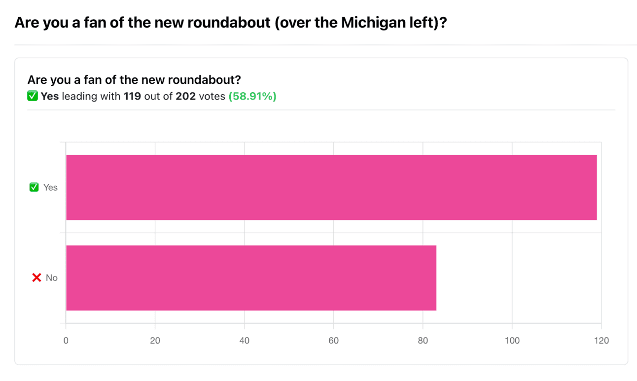 ✅“It’s Kinda Better, But…”That was the top vibe. Fans agree that, in theory, roundabout > Michigan Left. But even some yes-voters had mixed feelings agreeing with the no’s, noting that it’s too small, prone to congestion, full of close calls, and practically tangled up with nearby stoplights.