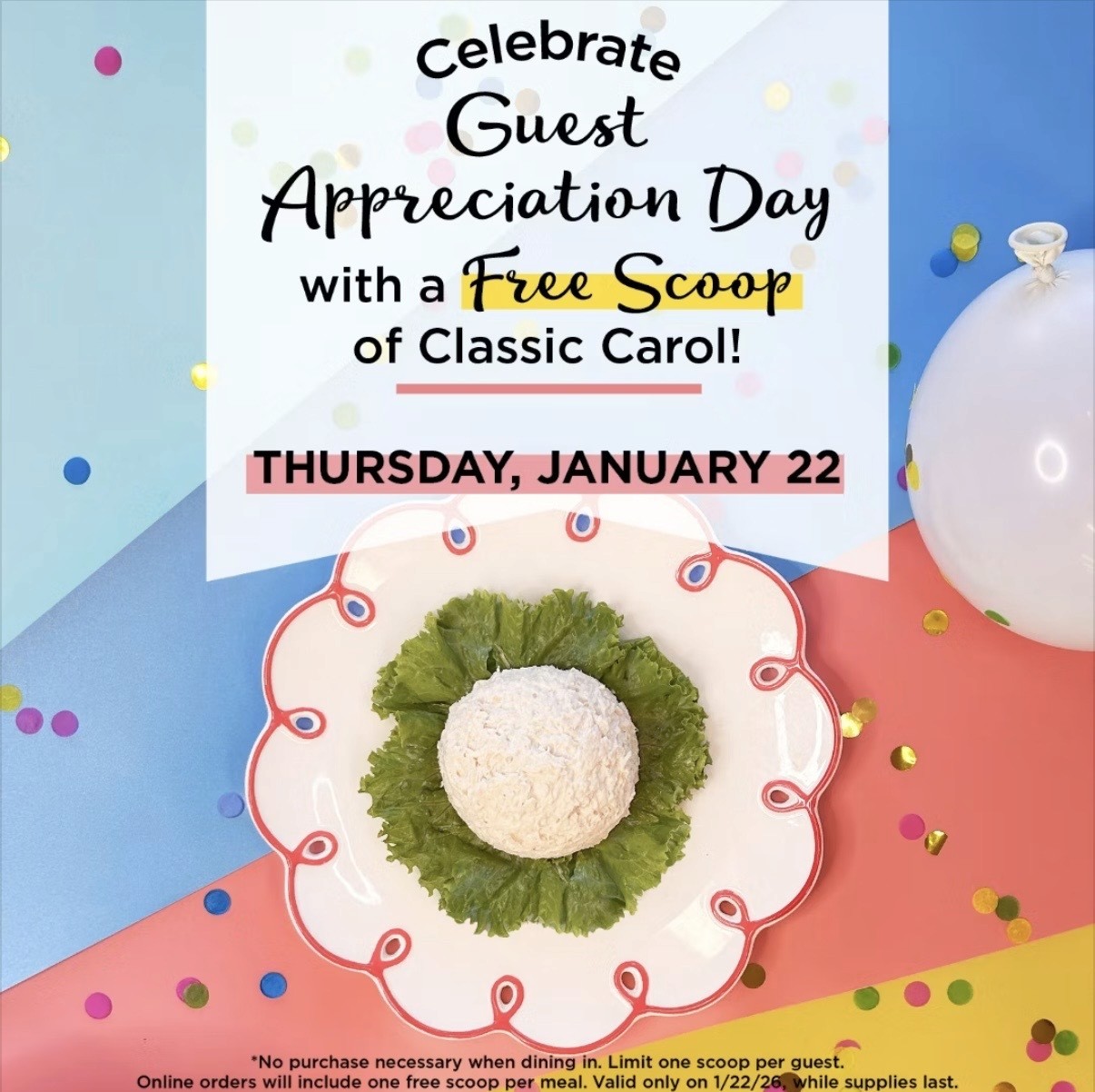 Chicken Salad Chick in Fishers is celebrating Guest Appreciation Day this Thursday, and will be giving out a free scoop of Classic Carol to each customer.