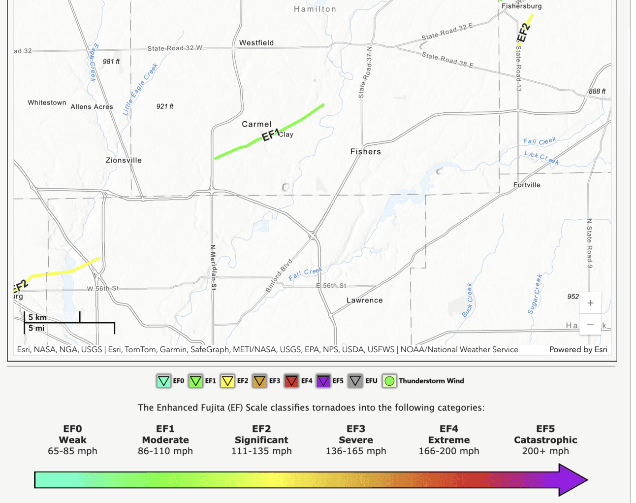 The National Weather Service reported there were 12 tornadoes in the state last Wednesday. Two of those touched down just nearby Fishers (see map above).