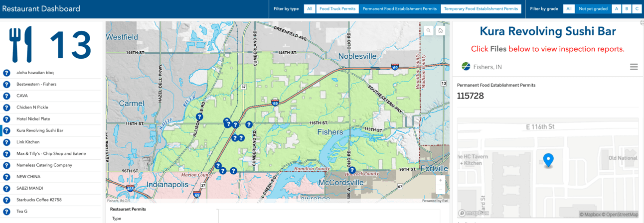On the dashboard, if you select “not graded”, select “permanent food establishments”, then zoom out to see all of the Fishers area. You will get a listing of some new places coming to Fishers.