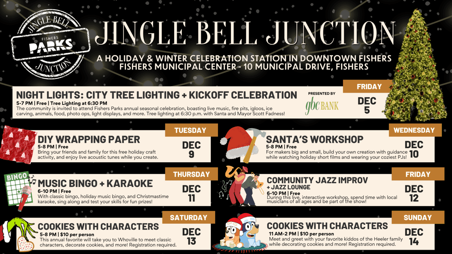 Fishers Parks is debuting a brand-new holiday spot this year, and it’s a fun one — the Jingle Bell Junction. It will be a large, heated tent right near the Nickel Plate Amphitheater. Each night of the week will have different themed events, live music, and hands-on activities for the whole crew. And a huge bonus...almost all of these events are free!