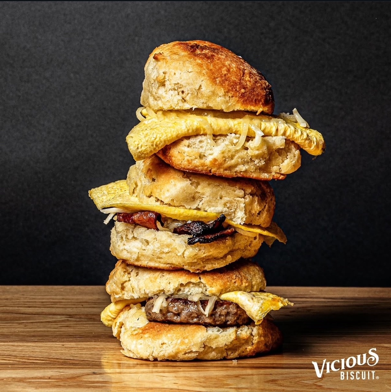 Vicious Biscuit offers Southern-inspired, fast-casual food, including over-the-top biscuit sandwiches like the “Fat Boy” and Flame Thrower,” along with Southern-style appetizers, shareable items, and a variety of house-made jams and butters. You can check out the full menu here.
