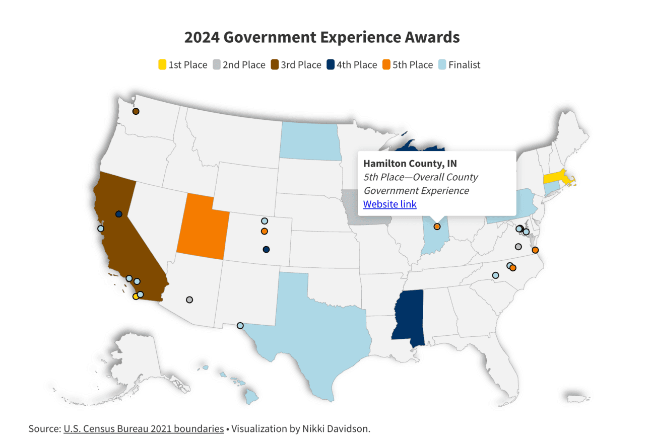 The State of Indiana was also a finalist for having a tech-forward government website. Like using AI in their help chatbot. You can see all the awards and finalists here.