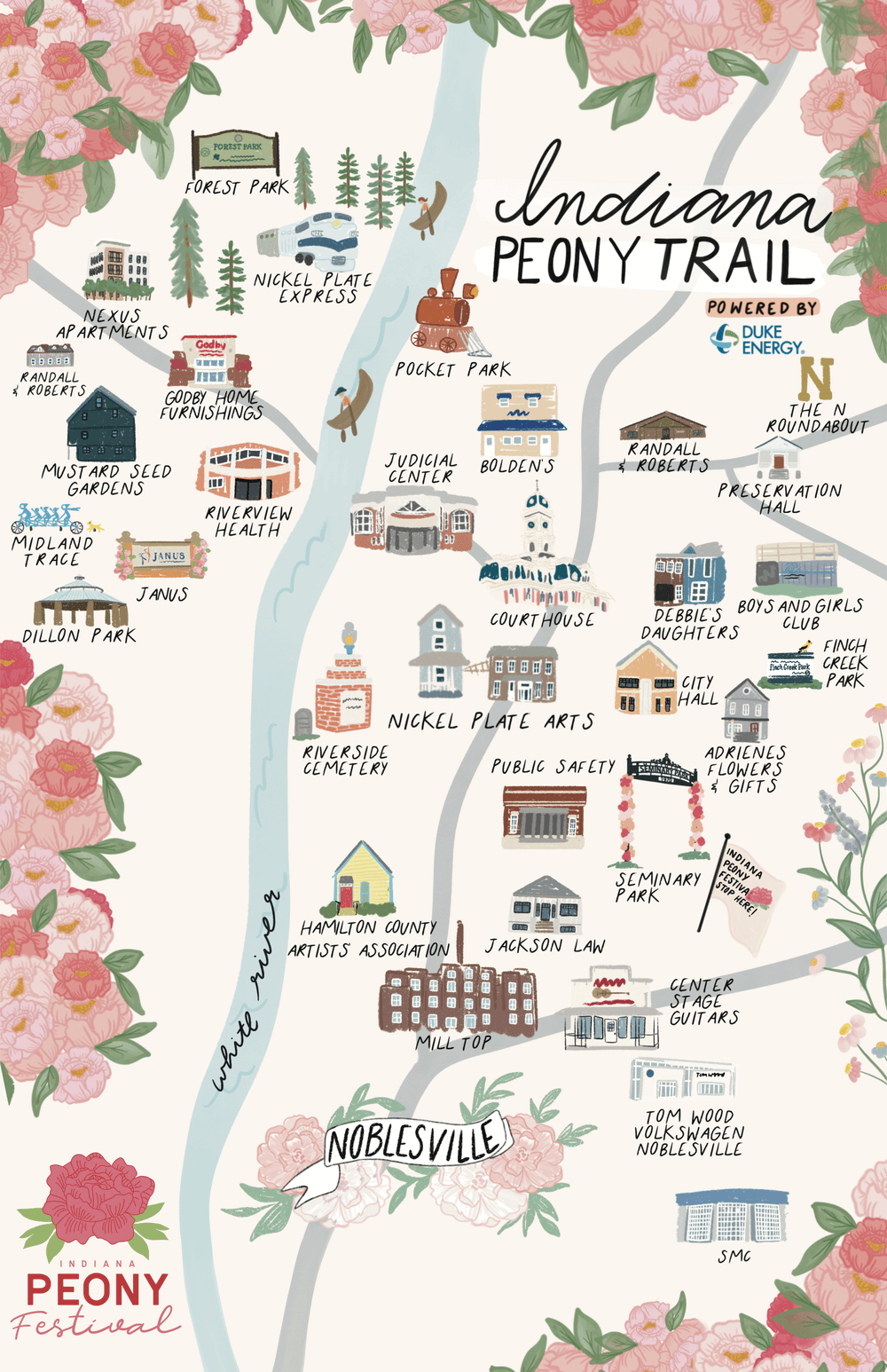 Map of places and businesses part of the Noblesville “Peony Trail”