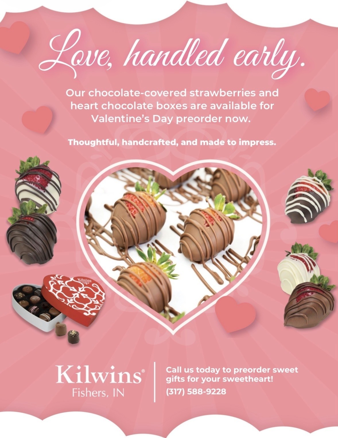Chocolate-covered strawberries and heart-shaped chocolate boxes are available for Valentine’s Day at Kilwins Fishers.