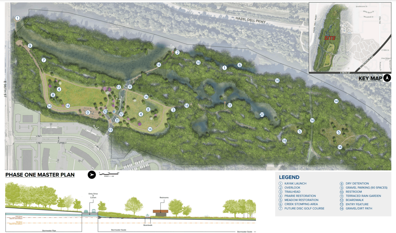 A new park is coming just west of the 96th Street and Allisonville Road intersection! It will feature over 120 acres of parkland, and 5000 feet of riverfront land. The surveys you answered last year helped them come up with the amenities like: